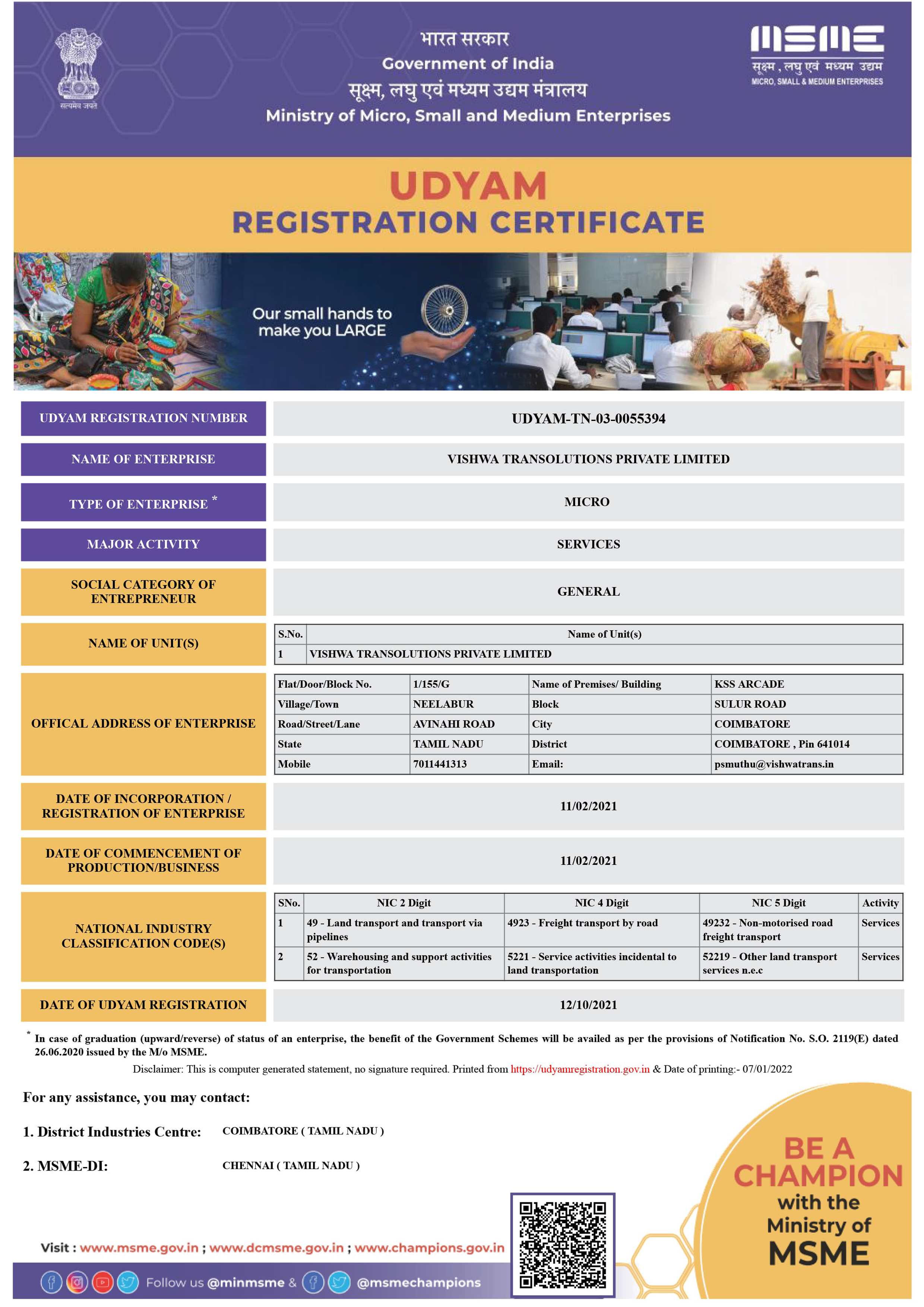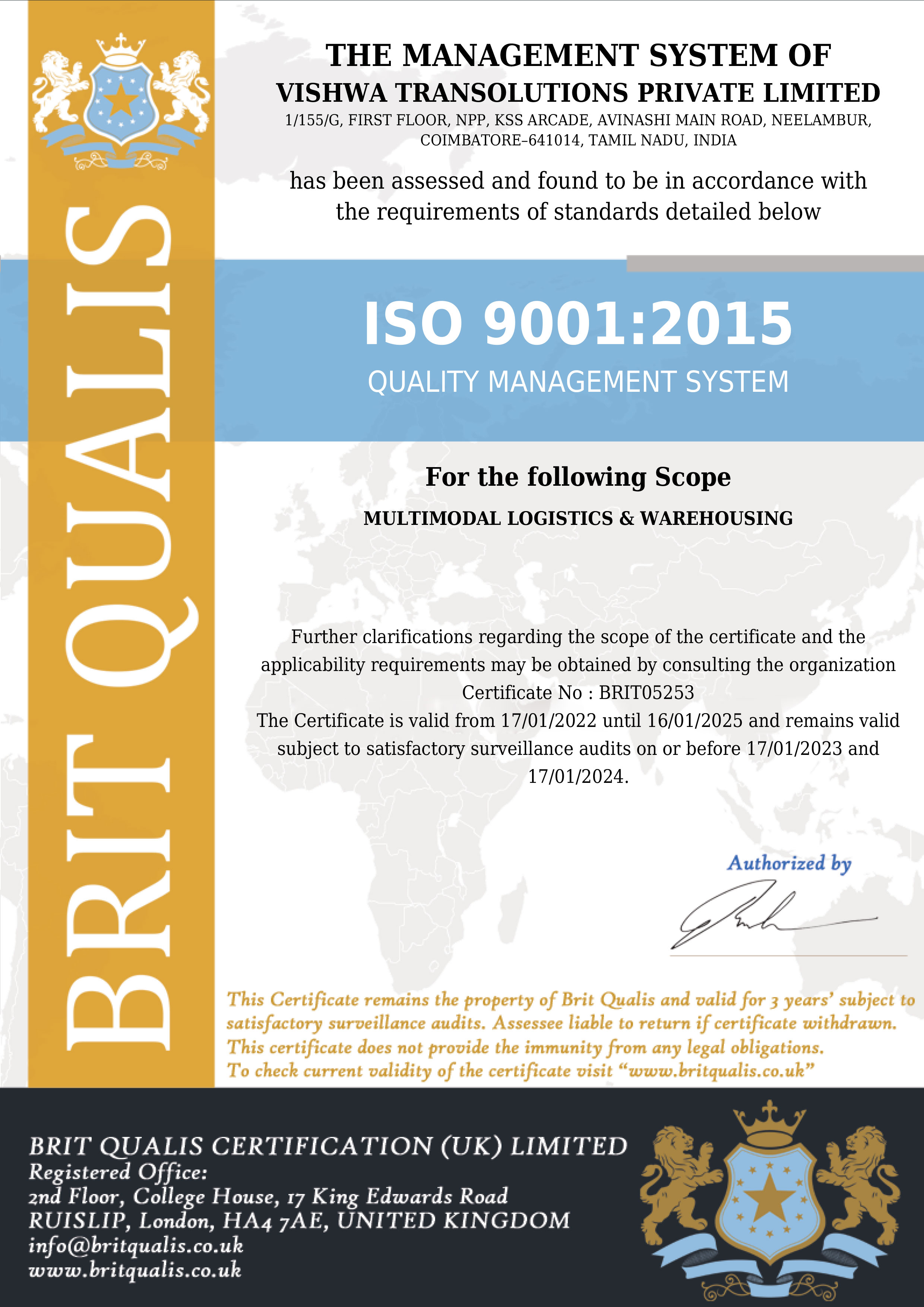“VISHWA TRANSOLUTIONS PRIVATE LIMITED” started in 2021 at Coimbatore with one target—to disentangle transportation the board. Across the nation, dock to dock, and over all significant transportation modes, “VISHWA TRANSOLUTIONS PRIVATE LIMITED” Global Logistics associates organizations that need to deliver their items with bearers who transport merchandise rapidly, safely and cost-successfully.
